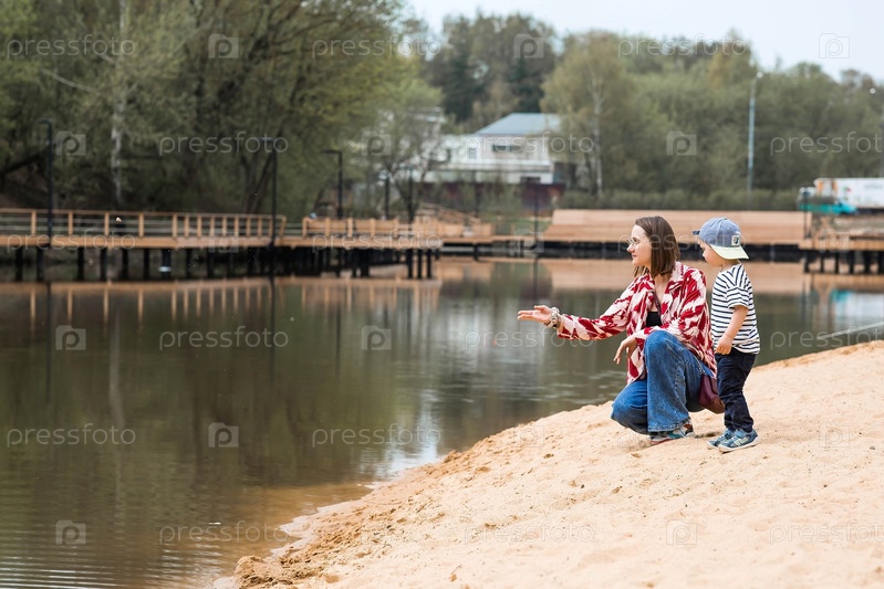 Летний образ жизни. Милый маленький мальчик и его мама весело играют с песком на пляже у воды. Концепция семейного развлечения и досуга