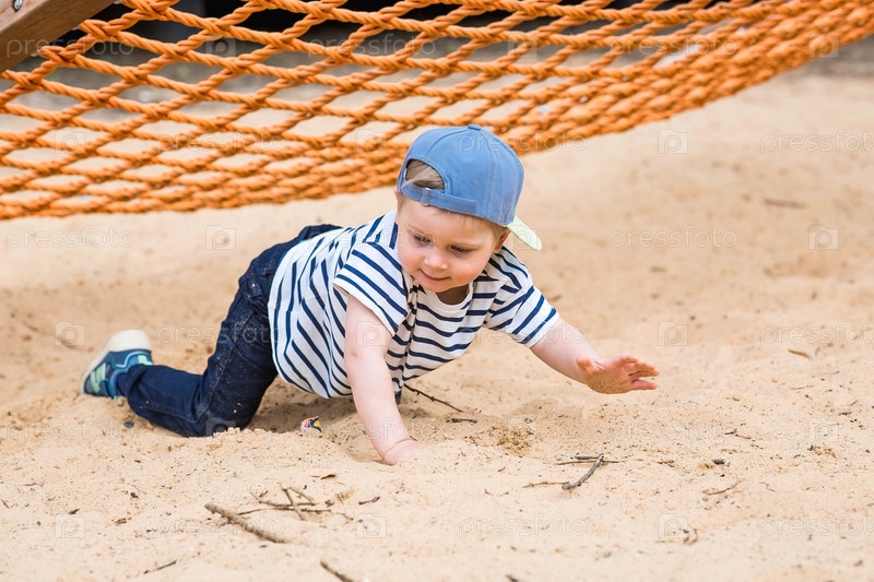 Летний образ жизни. Милый маленький мальчик весело играет в гамаке на пляже на современной игровой площадке. Концепция семейного развлечения и досуга