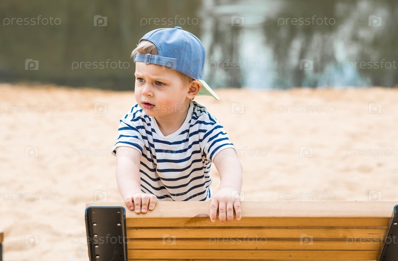 Летний образ жизни. Милый маленький мальчик весело играет на современной открытой игровой площадке. Концепция семейного развлечения и досуга