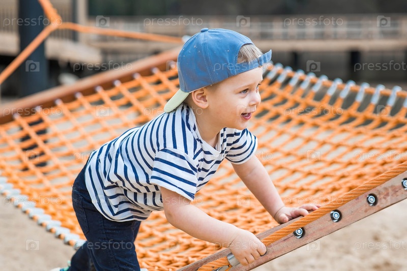 Летний образ жизни. Милый маленький мальчик весело играет в гамаке на пляже на современной игровой площадке. Концепция семейного развлечения и досуга