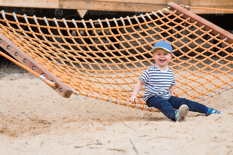 Летний образ жизни. Милый маленький мальчик весело играет в гамаке на пляже на современной игровой площадке. Концепция семейного развлечения и досуга