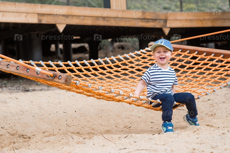 Образ жизни. Милый маленький мальчик сидит в гамаке на современной открытой игровой площадке. Концепция семейного развлечения и досуга