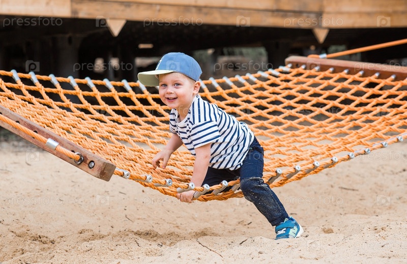 Образ жизни. Милый маленький мальчик сидит в гамаке на современной открытой игровой площадке. Концепция семейного развлечения и досуга