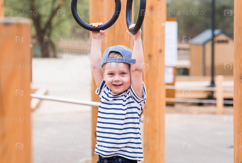Образ жизни. Милый маленький мальчик висит на кольцах на спортивной площадке на свежем воздухе. Концепция детского спорта и физического развития
