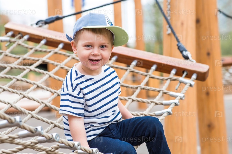Образ жизни. Милый маленький мальчик лежит в гамаке на современной открытой игровой площадке. Концепция семейного развлечения и досуга