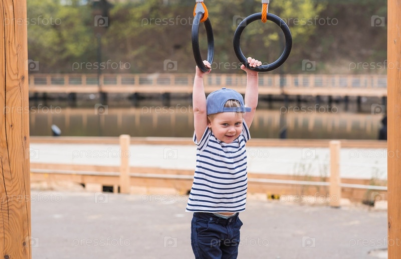 Образ жизни. Милый маленький мальчик висит на кольцах на спортивной площадке на свежем воздухе. Концепция детского спорта и физического развития