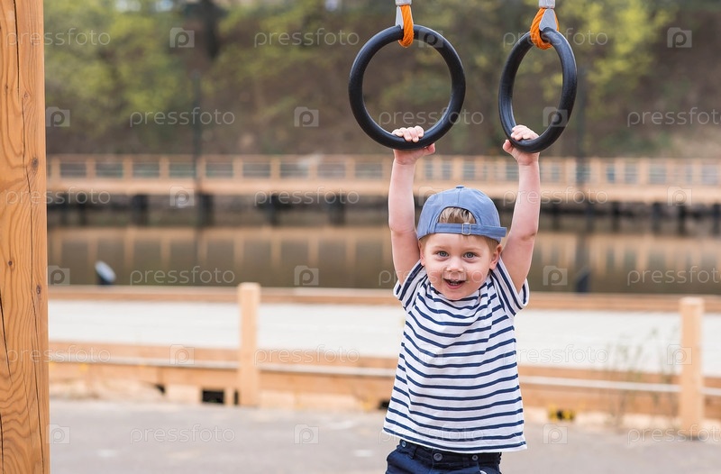Образ жизни. Милый маленький мальчик висит на кольцах на спортивной площадке на свежем воздухе. Концепция детского спорта и физического развития