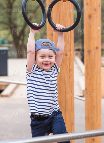 Образ жизни. Милый маленький мальчик висит на кольцах на спортивной площадке на свежем воздухе. Концепция детского спорта и физического развития