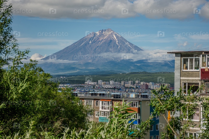 Город с вулканом на заднем плане