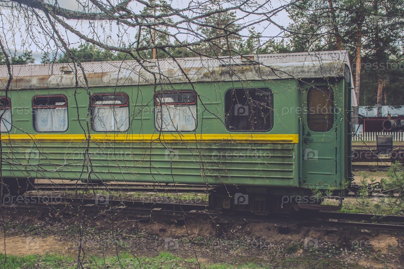 Зеленый вагон припаркован на путях. Вагон старый и ржавый