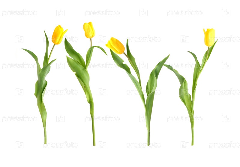 Одиночный, яркий желтый тюльпан с сочными зелеными листьями представлен изолированно на простом белом фоне