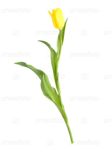 Одиночный, яркий желтый тюльпан с сочными зелеными листьями представлен изолированно на простом белом фоне