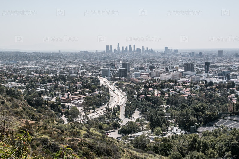 Вид на Лос-Анджелес с Голливудских холмов. Центр города Лос-Анджелес. Движение по автостраде 101