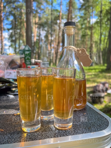 Три стопки, наполненные напитком, стоят на столе