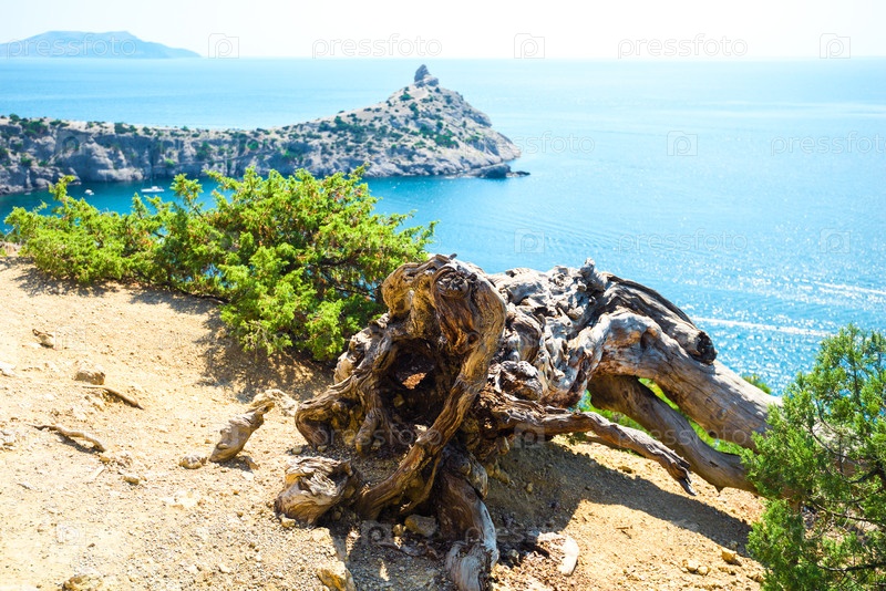 Красивый пейзаж с живописным сухим корнем дерева на фоне Черного моря. Крымский полуостров. Россия