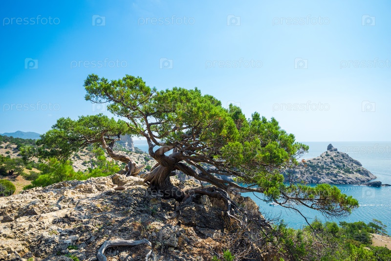 Живописная декоративная сосна бонсай на скалистом склоне с видом на залив Делилиман и мыс Капчик. Крымский полуостров. Россия