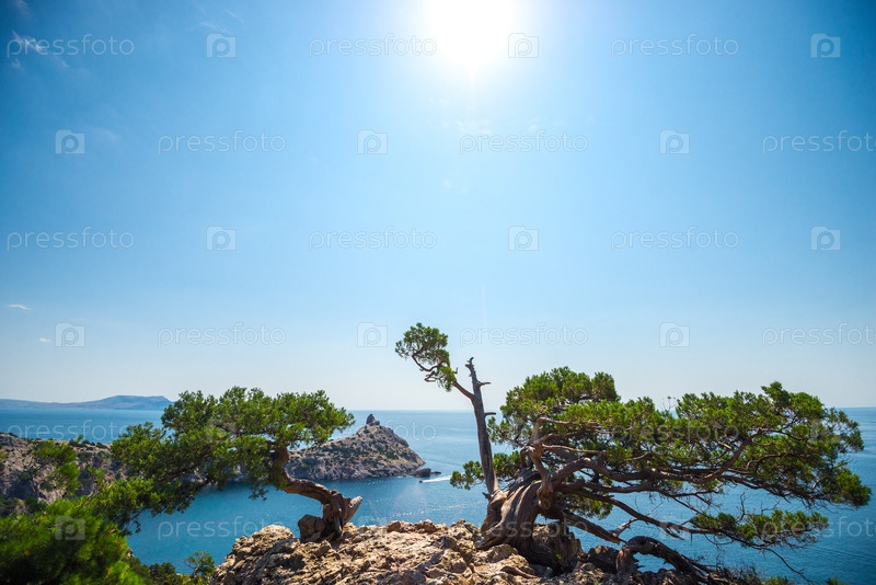 Живописная искривленная сосна бонсай на скалистом склоне с морем на заднем плане. Крымский полуостров. Россия