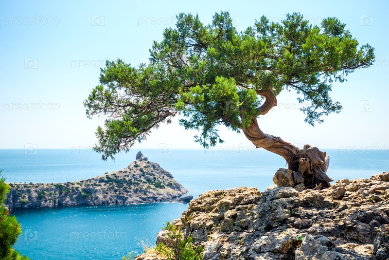 Живописная декоративная сосна бонсай на скалистом склоне с видом на залив Делилиман и мыс Капчик. Крымский полуостров. Россия