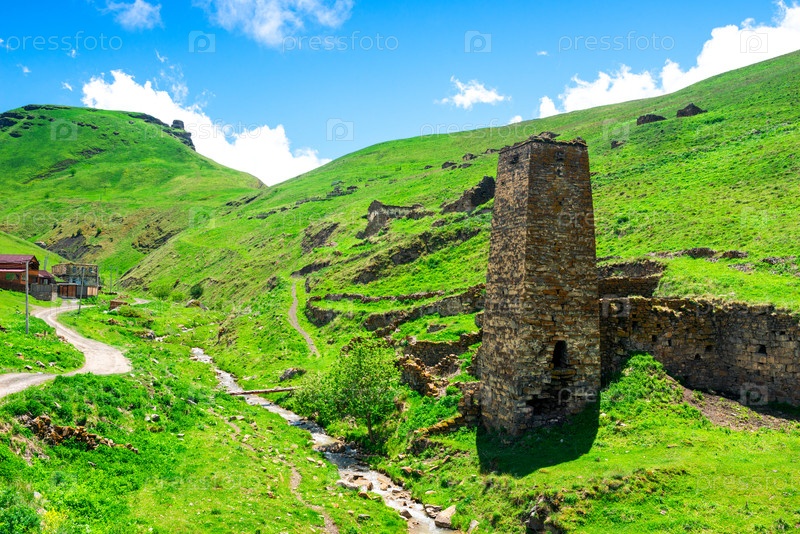 Древние живописные руины горного села Галиат. Северный Кавказ. Россия
