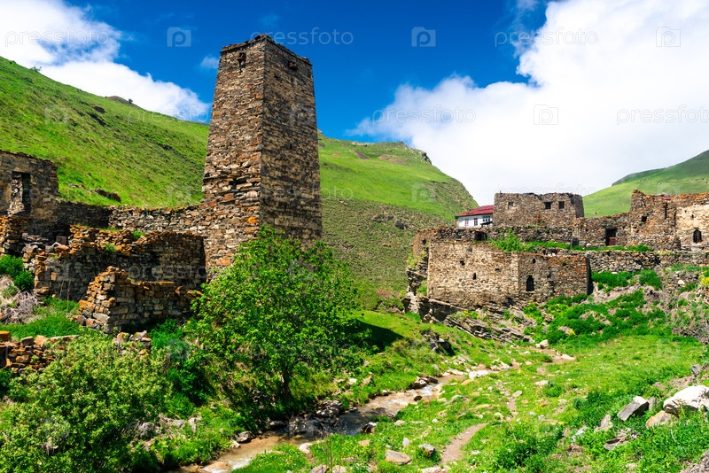 Древние живописные руины горного села Галиат. Северный Кавказ. Россия