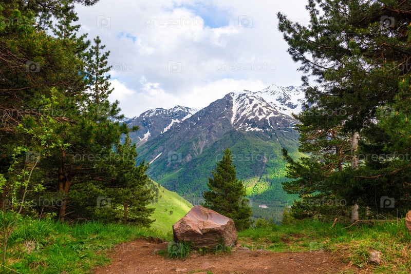 Красивый вид горной природы на фоне снежной вершины Эльбруса в солнечную погоду. Горцы Северного Кавказа. Россия