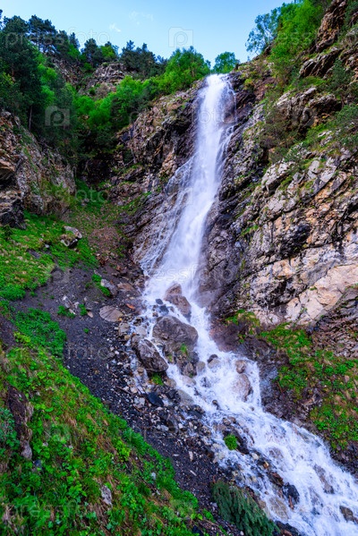 Бурный водопад, падающий с каменной скалы. Северный Кавказ. Россия