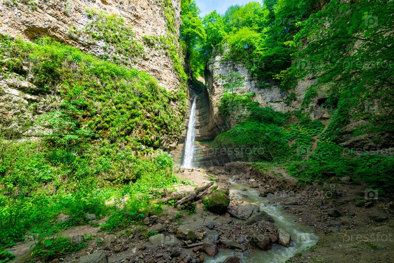 Живописный водопад Адай-Су в скалистом ущелье. Кабардино-Балкария. Россия