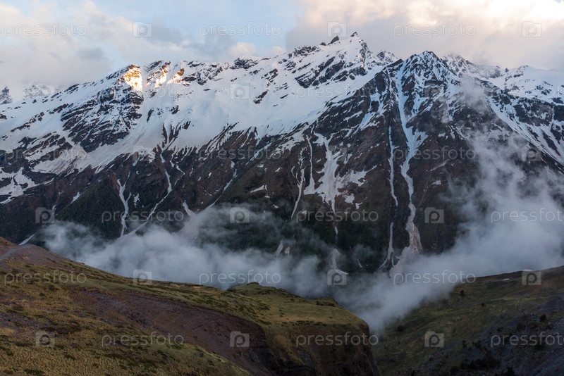 Прекрасный вид на суровые снежные вершины Эльбруса на закате с низкими облаками. Северный Кавказ. Россия