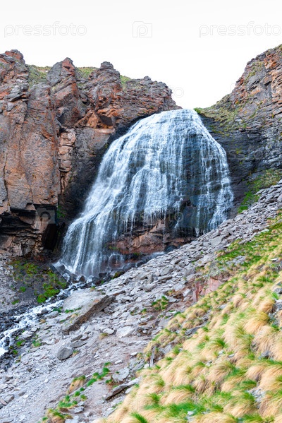 Бурный водопад 'Девичьи косы', падающий с наклонной скальной стены. горы Северного Кавказа. Россия