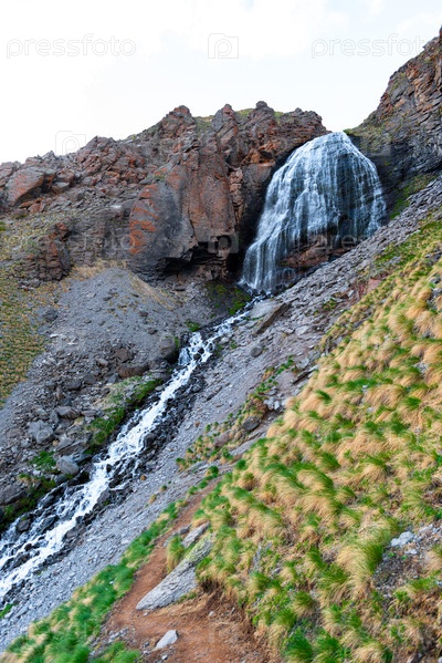 Бурный водопад 'Девичьи косы', падающий с наклонной скальной стены. горы Северного Кавказа. Россия