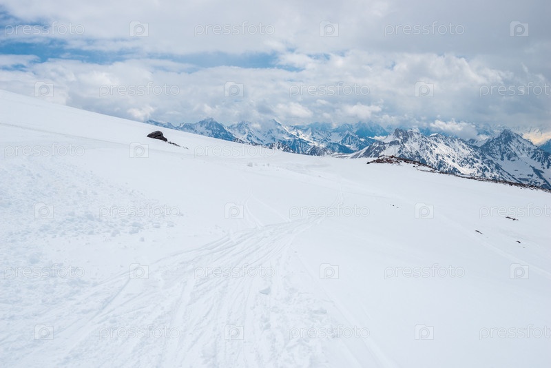 Лыжные трассы на заснеженном склоне высоко в горах. Эльбрус. Кавказ