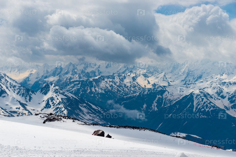 Впечатляющий вид на скалистые белые вершины гор Северного Кавказа с заснеженного склона Эльбруса во время шторма. Кавказ