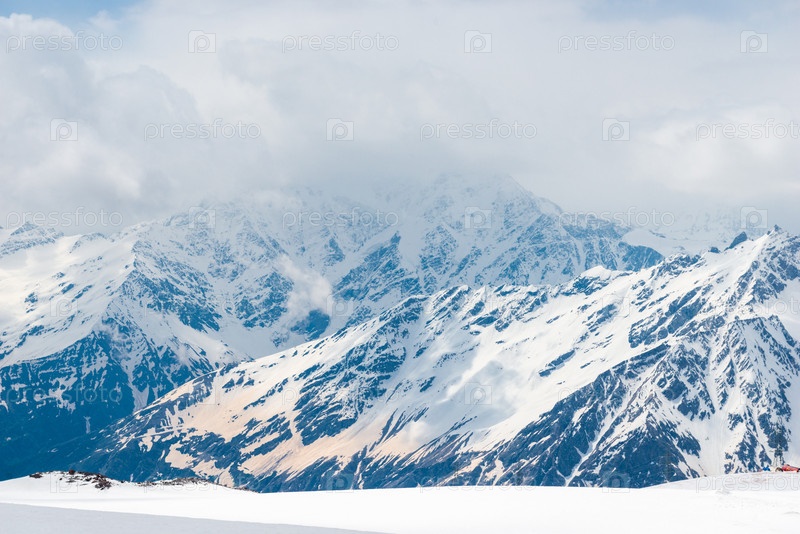 Живописный вид на скалистые белые вершины гор Северного Кавказа с заснеженного склона Эльбруса. Кавказ