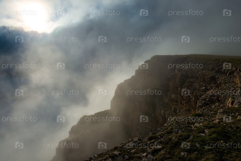 Живописный драматический вид с большой высоты на край скалы и низкие облака. Облачный пейзаж