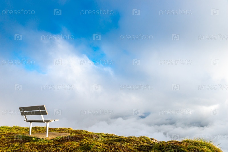 Живописный суровый пейзаж со скамейкой на краю обрыва на фоне красивых густых облаков высоко в горах. Кавказ