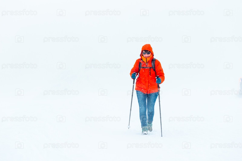 Туристка взбирается по заснеженному склону горы в метель. Эльбрус. Кавказ