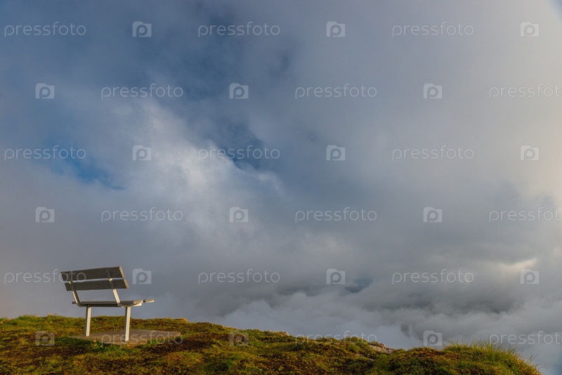 Живописный суровый пейзаж со скамейкой на краю обрыва на фоне красивых густых облаков высоко в горах. Кавказ