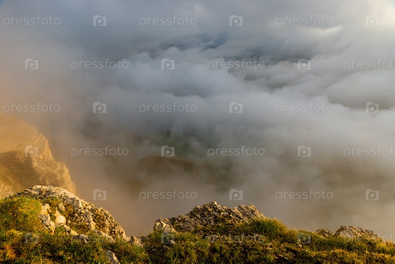 Живописный драматический вид с большой высоты на край скалы и низкие облака. Облачный пейзаж