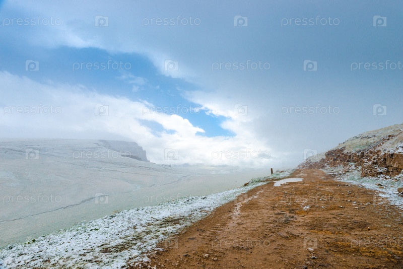 Живописный суровый пейзаж с грунтовой дорогой и первым снегом на траве горного плато. Кавказ