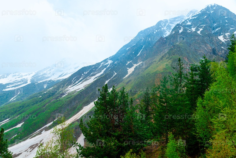 Драматический вид на живописный горный склон с елями на переднем плане в плохую погоду. Кавказ