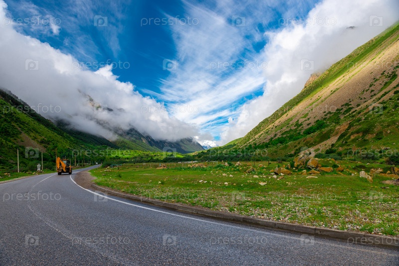 Живописный пейзаж с дорогой и горой, скрытой облаками. Кавказ