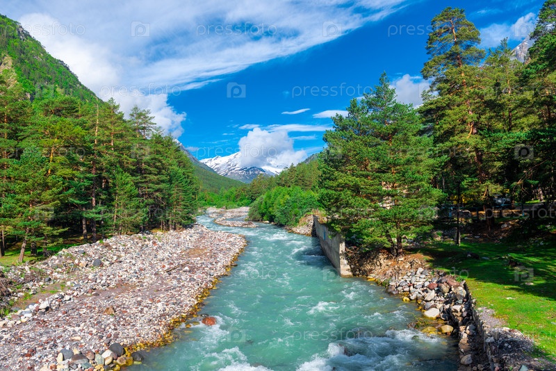 Красивая бурная горная река с чистой лазурной водой. Кавказ