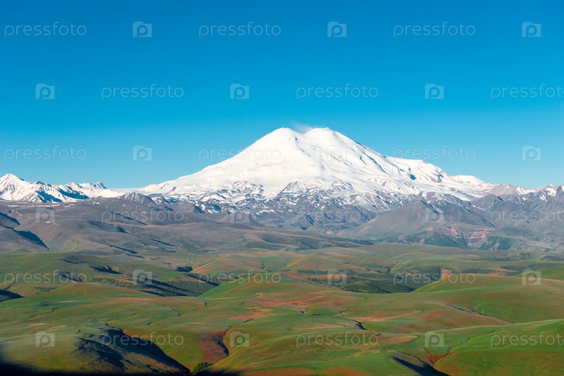 Живописный вид на белую вершину Эльбруса. Вид с плато Канжол