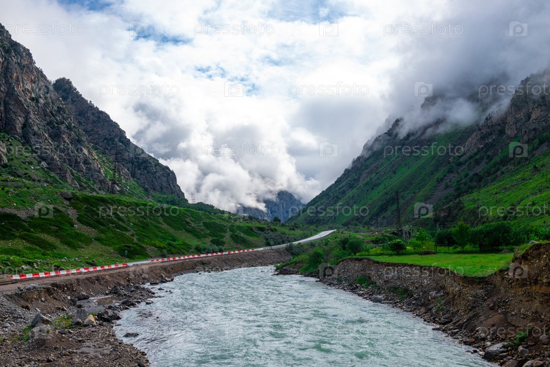 Живописный пейзаж с горной рекой, дорогой и горой, скрытой облаками. Кавказ