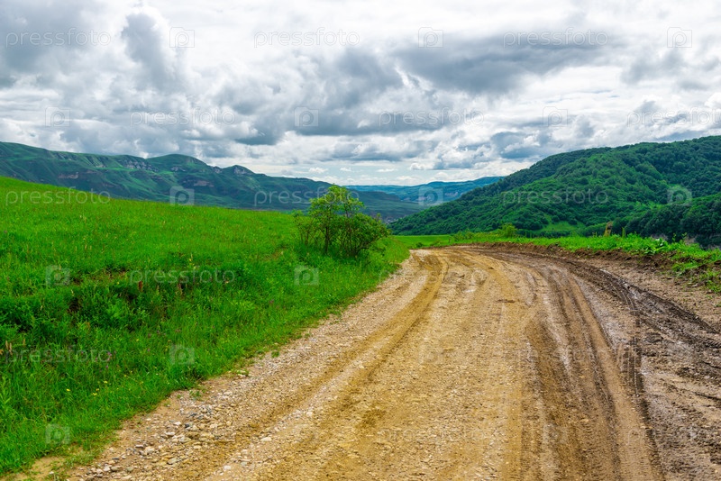 Грунтовая дорога в горах среди зеленых альпийских лугов. Кавказ