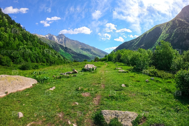 Живописный луг высоко в горах в солнечную погоду. Кавказ