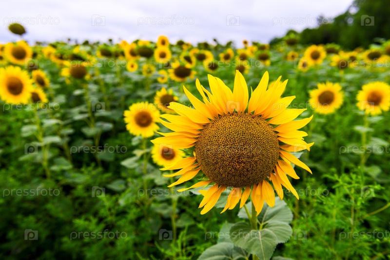 Поле желтых подсолнухов рано утром в пасмурную погоду