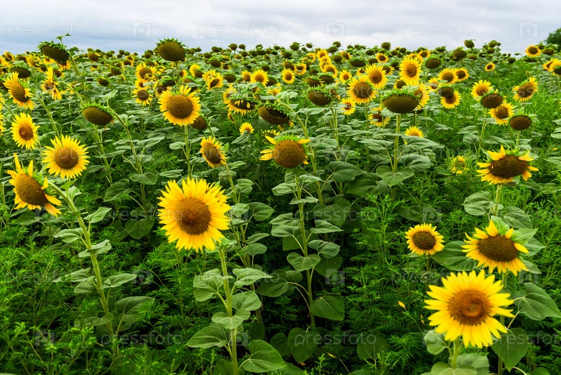 Поле желтых подсолнухов рано утром в пасмурную погоду