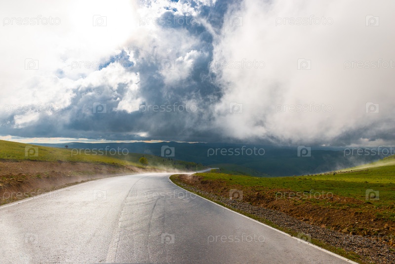 Драматический пейзаж с мокрой асфальтированной дорогой в плохую погоду в горах. Кавказ