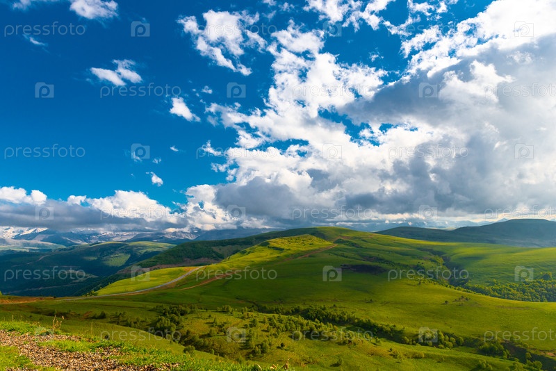 Красивый облачный пейзаж над зелеными холмами в долине Джилы-Су. Приэльбрусье